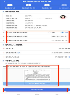 注意备案起始时间可提前于当前操作日期,应早于入院时间。备案指定时间按需选择长期或指定时间,填写联系人、地址。点击查看{个人承诺书}在确认信息无误后点击{开始签名},完成电子签名后提交备案,无需审核。